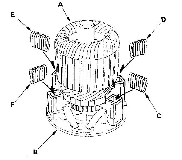 10. Check with an ohmmeter that no continuity exists between the commutator (A) and armature coil core (B), and between the commutator and armature shaft (C). If continuity exists, replace the armature.
