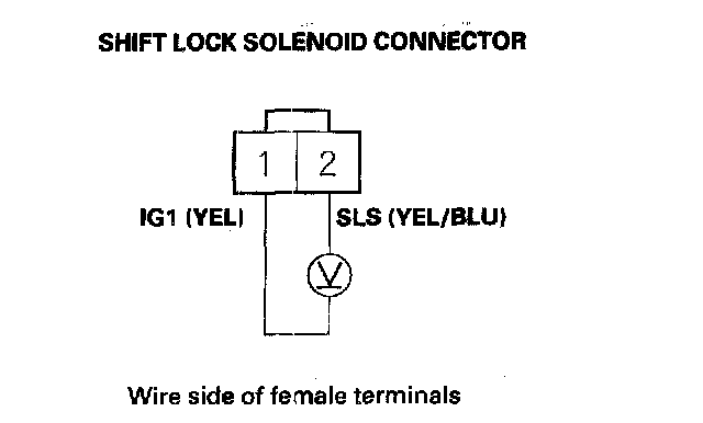 NO - Check for a blown No. 21 (7.5 A) fuse in the under-dash fuse/relay box. If the fuse is OK, repair open or short in the wire between the shift lock solenoid connector and the under-dash fuse/relay box.