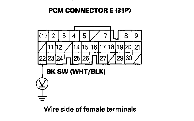 19. Check for continuity between PCM connector terminal E22 and brake pedal position switch 4P connector terminal No. 2.