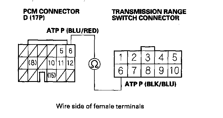 27. Check for continuity between PCM connector terminal D6 and transmission range switch connector terminal No. 6.