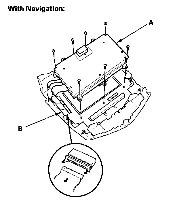 4. With navigation system: Remove the mounting screws and display unit (A) from the printed circuit board (B).