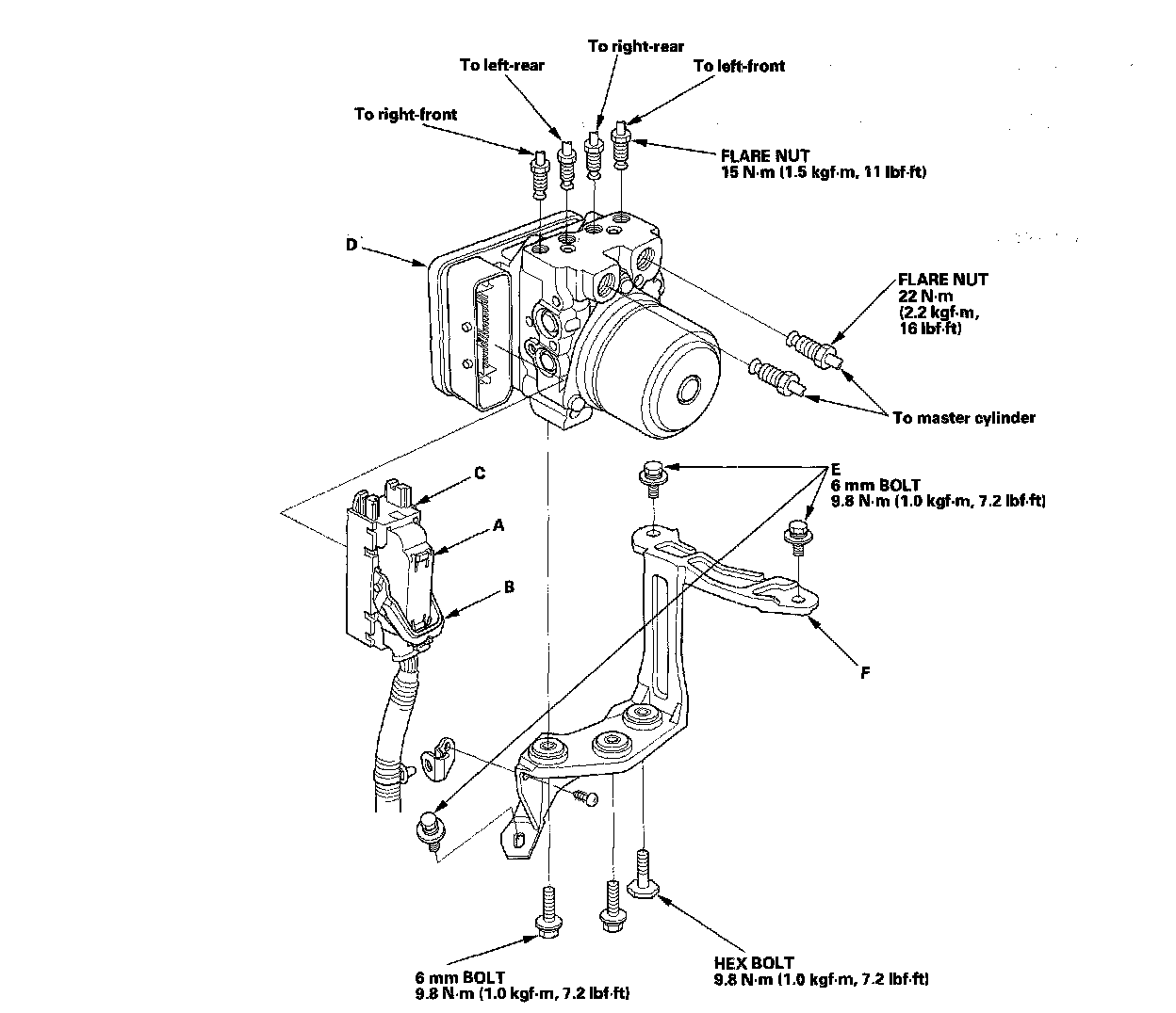 2. Disconnect the six brake lines from the ABS/TCS modulator-control unit (D).