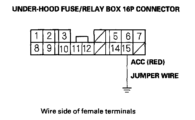 9. Momentarily connect under-hood fuse/relay box 16P connector terminal No.15 to body ground with a jumper wire several times.