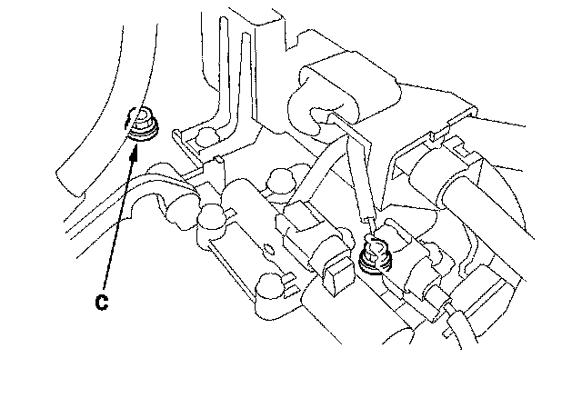 14. Start the engine, and shift to the 1 position. Measure the 1st clutch pressure at the 1st clutch pressure inspection hole (B) and the 1st-hold clutch pressure at the 1st-hold clutch pressure inspection hole (C) while holding the engine speed at 2,000 rpm.