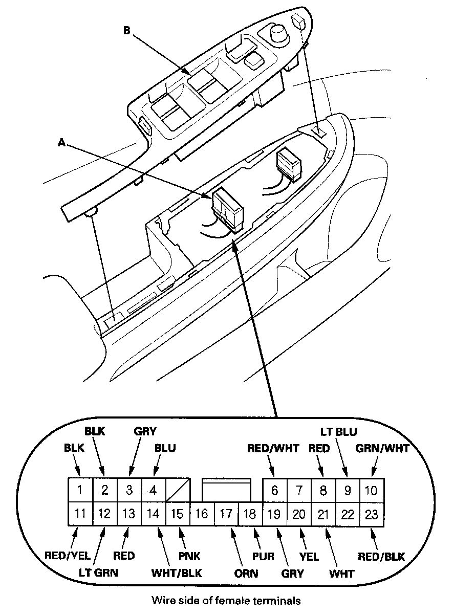 3. Disconnect the 23P connector (A) from the power window switch (B).