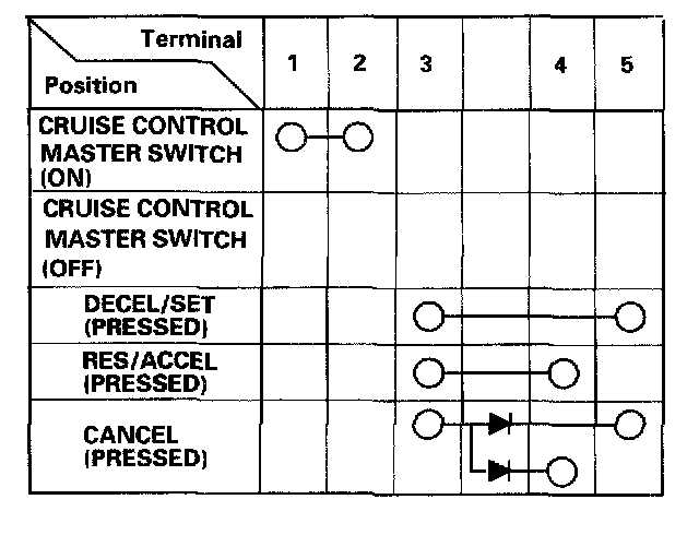 - If there is continuity, and it matches the table, but switch failure occurred on the cruise control unit input test, check and repair the wire harness on the switch circuit.