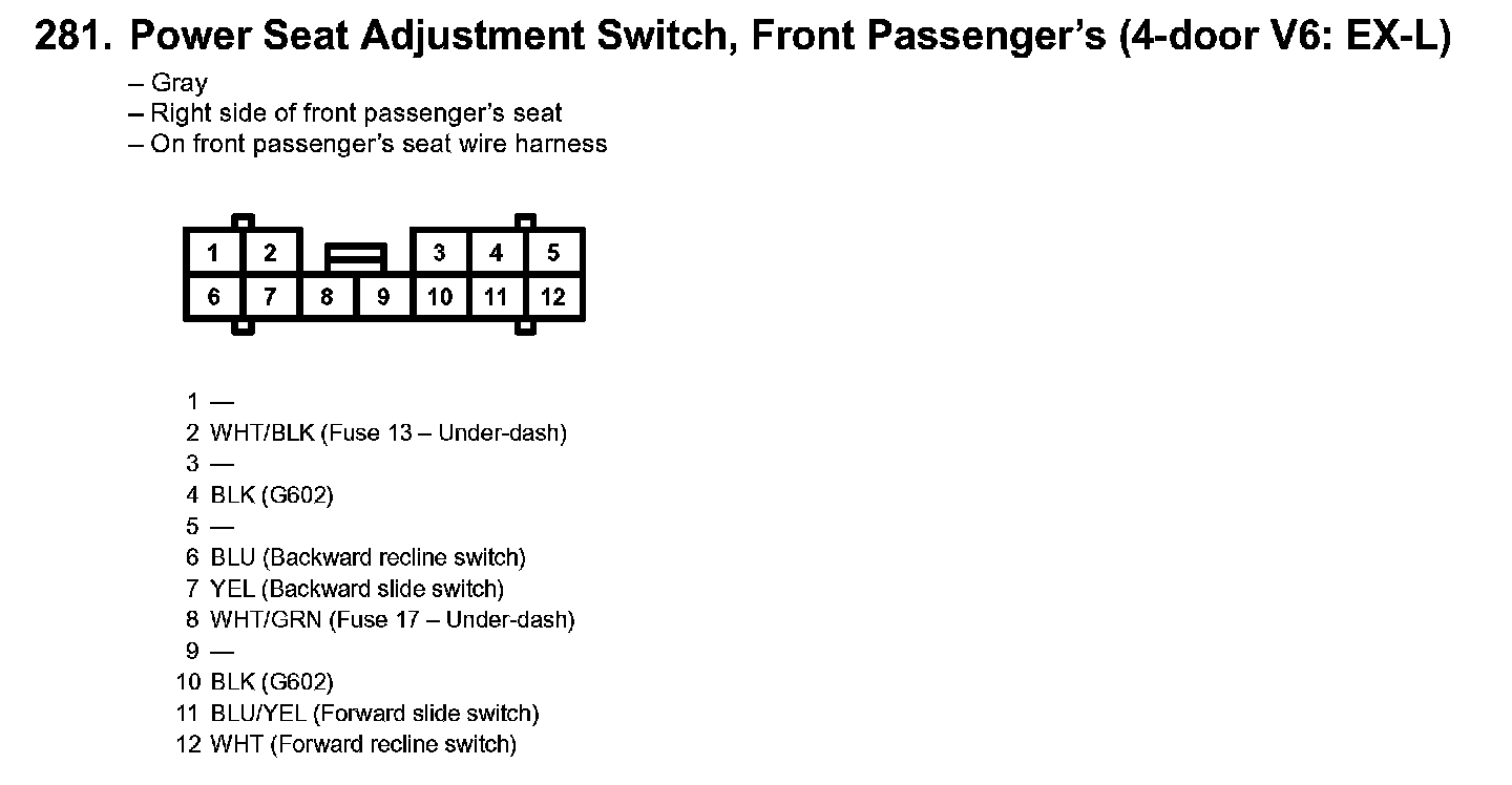 281. Power Seat Adjustment Switch, Front Passenger's (4-door V6: EX-L):