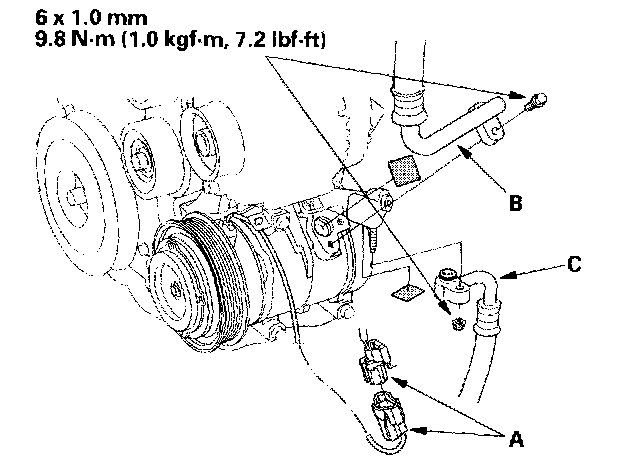7. Disconnect the compressor clutch connector (A). Remove the bolt and the nut, then disconnect the suction line (B) and discharge line (C) from the compressor. Plug or cap the lines immediately after disconnecting them to avoid moisture and dust contamination.