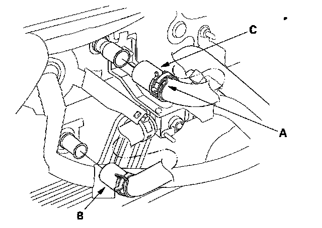 6. Slide the hose clamps (A) back, then disconnect the inlet heater hose (B) and the outlet heater hose (C) from the heater unit. Engine coolant will run out when the hoses are disconnected; drain it into a clean drip pan. Be sure not to let coolant spill on the electrical parts or the painted surfaces. If any coolant spills, rinse it off immediately.