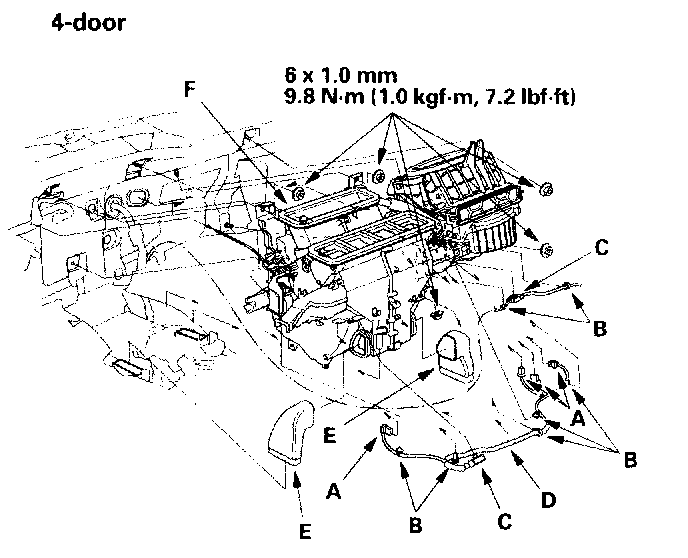 9. Disconnect the connectors (A) from the air mix control motor, the evaporator temperature sensor, the power transistor, and the recirculation control motor, then remove the wire harness clips (B), the connector clips (C) and the wire harness (D). Remove the heater ducts (E), then remove the mounting nuts and the blower-heater unit (F).