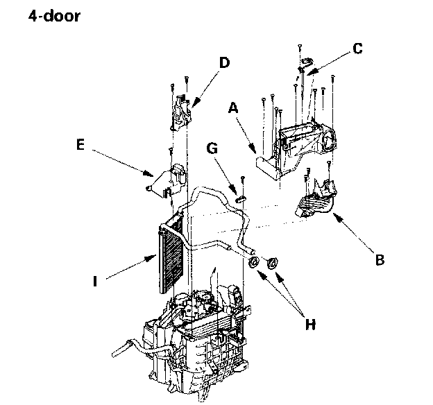 10. Remove the self-tapping screws, the evaporator temperature sensor (C) and the joint duct A, then remove the self-tapping screws and the joint duct B (4-door). Remove the self-tapping screws, then remove the passenger's heater outlet (D), and the heater core cover (E). Remove the self-tapping screws and the mode control motor (F) (2-door). Remove the self-tapping screws, the heater pipe brackets (G), the grommets (H) and carefully pull out the heater core (I) so you don't bend the inlet outlet pipes.