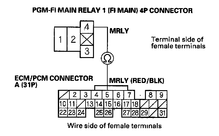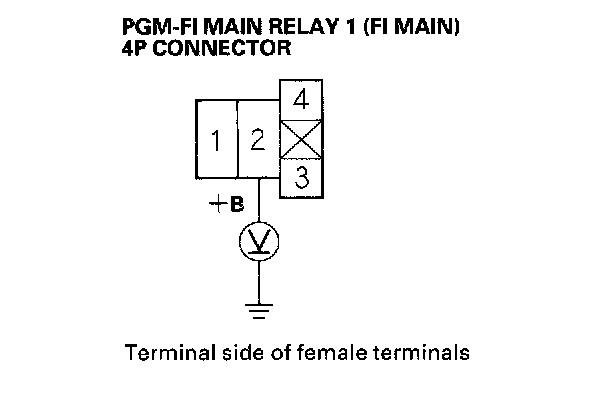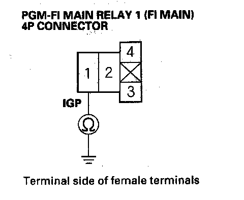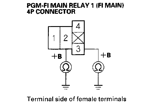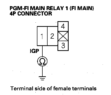 27. Check for continuity between body ground and PGM-FI main relay 1 (FI MAIN) 4P connector terminals No.2 and No.3 individually.