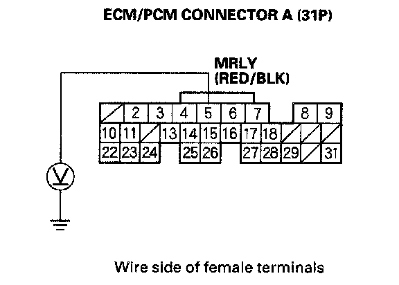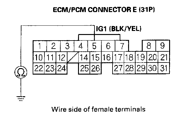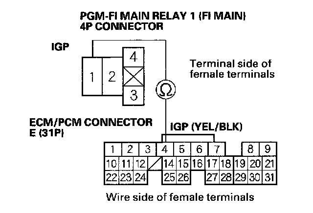 30. Check for continuity between PGM-FI main relay 1 (FI MAIN) 4P connector terminal No.1 and body ground.