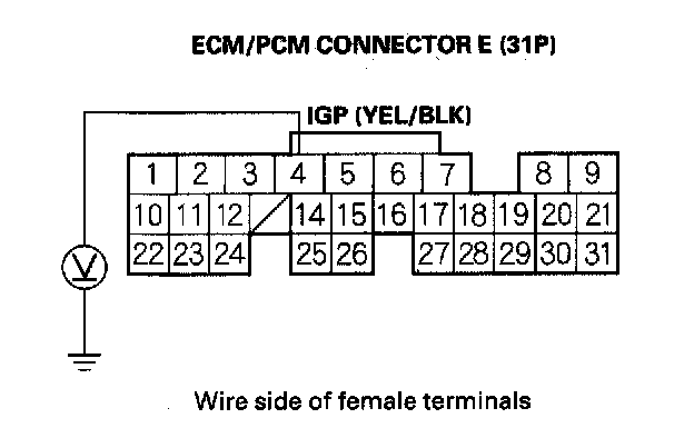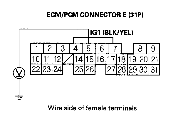 47. Measure voltage between ECM/PCM connector terminal E5 and body ground.