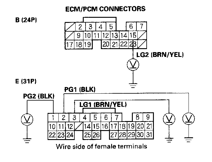 62. Measure voltage between body ground and ECM/PCM connector terminals B15, E1, E2, and E3 individually.