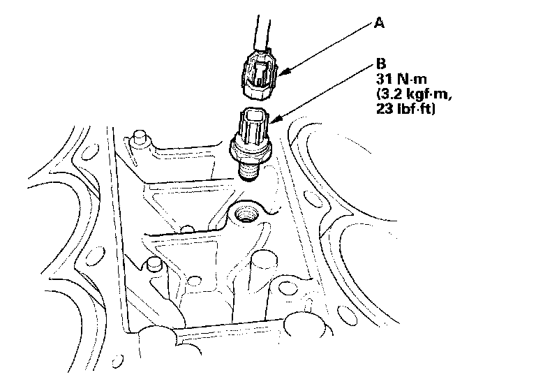 3. Disconnect the knock sensor connector (A), then remove the knock sensor (B).