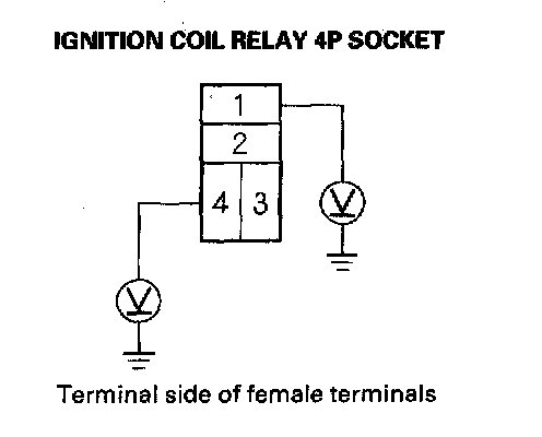 3. Measure the voltage between ignition coil relay 4P socket terminal No. 1 and body ground, then terminal No. 4 and body ground.