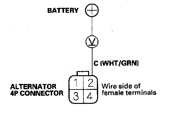 5. Measure the voltage between alternator 4P connector terminal No. 2 and the positive terminal of the battery