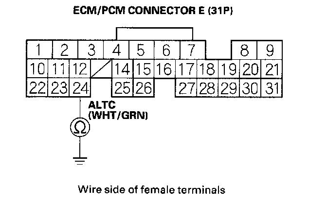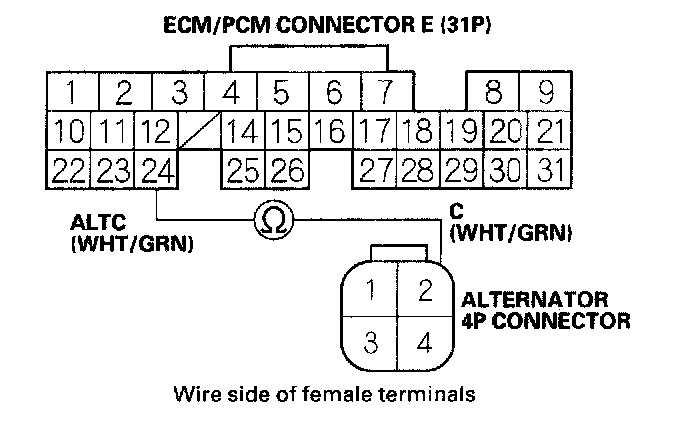 11. Check for continuity between ECM/PCM connector terminal E24 and alternator 4P connector terminal No. 2.