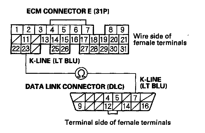 NO - Repair open in the wire between DLC terminal No.7 and the ECM (E23). After repairing the wire, check for Temporary DTCs or DTCs with the HDS. If there are Temporary DTCs or DTCs, go to the indicated DTC's troubleshooting.