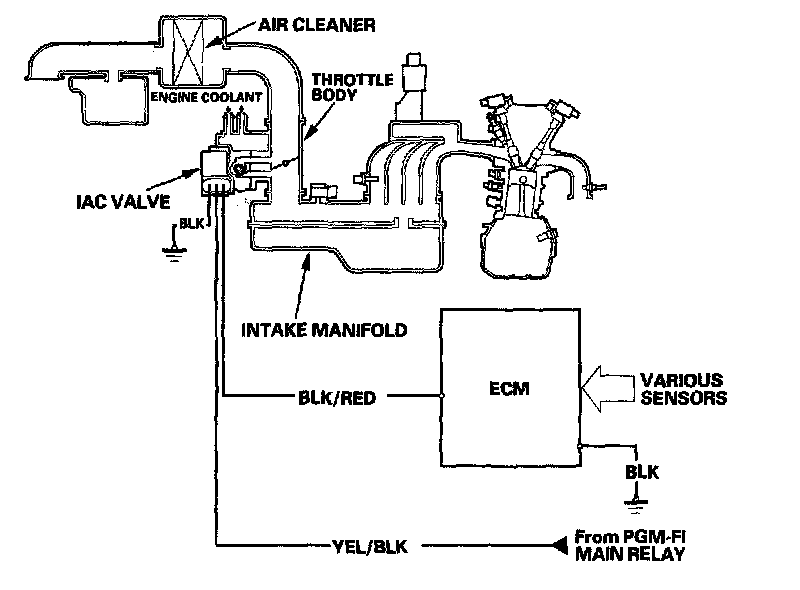 When the engine is cold, the A/C compressor is on, the transmission is in gear, or the brake pedal is pressed, the ECM controls current to the IAC valve to maintain the correct idle speed. Refer to the System Diagram to see the functional layout of the system.