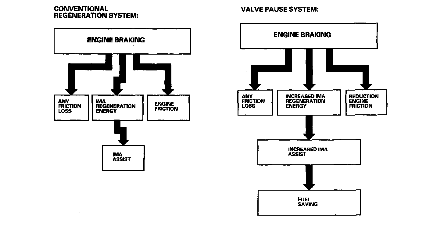 The valve pause system is designed to reduce engine friction by closing the intake/exhaust valves of the No.2, No.3, and No.4 cylinders during deceleration. The energy corresponding to the reduced volume of engine braking power is applied to the regenerated (generation) energy of the IMA motor. As the regenerated energy increases, the system increases the assist power of the IMA motor during acceleration to improve fuel economy.