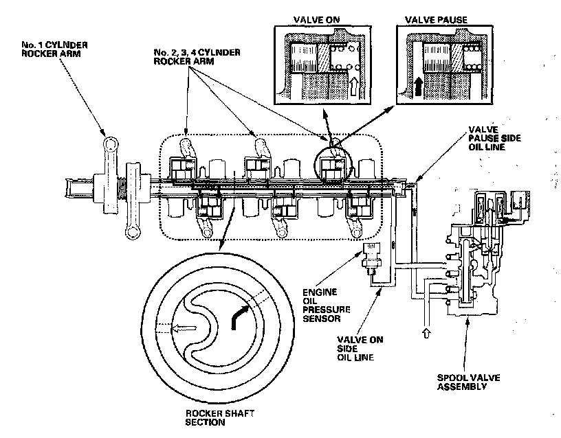 The Valve Pause System uses a synchronizing piston to lock and unlock the rocker arms from the camshaft. The synchronizing piston is driven in and out of the rocker arm by oil pressure supplied by two oil passages in the rocker shaft and controlled by a 3-way spool valve The synchronizing piston also has a light return spring to hold the rocker in the on position when there is no oil pressure. This allows the valves to operate during engine start when oil pressure is low.
