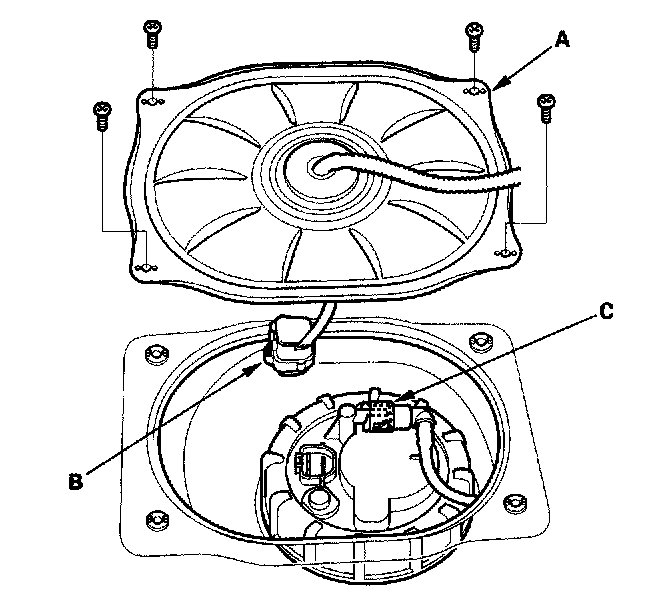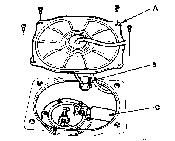 8. Remove the strainer case (A), the fuel gauge sending unit (B), and the wire harness (C).