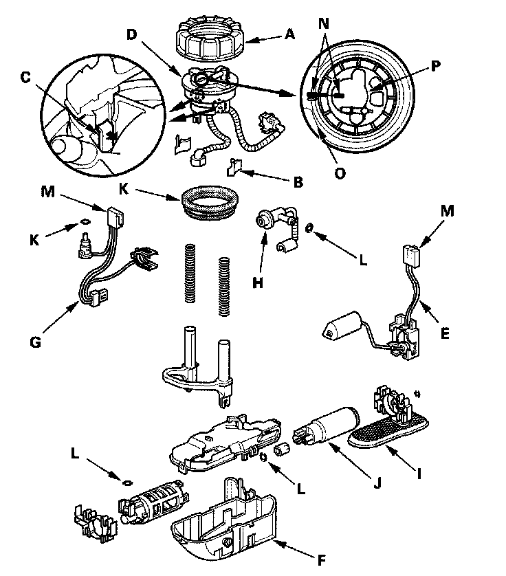 9. When connecting the fuel pump/fuel gauge sending unit, make sure the connection is secure and the suction filter (D) is firmly connected to the fuel pump (E).