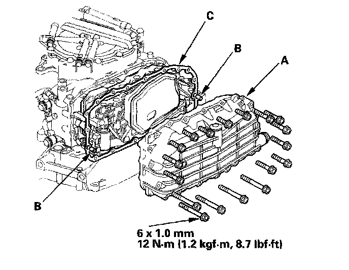 Install the ATF pan (A) with the two dowel pins (B) and the new gasket (C).
