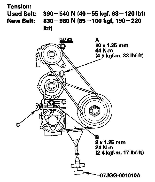 1. Apply a force of 98 N (10 kgf, 22 lbf), and measure the deflection at the mid point (A) between the alternator and crankshaft pulley. If the belt is worn or damaged, replace it. If the belt needs adjustment, go to step 2.