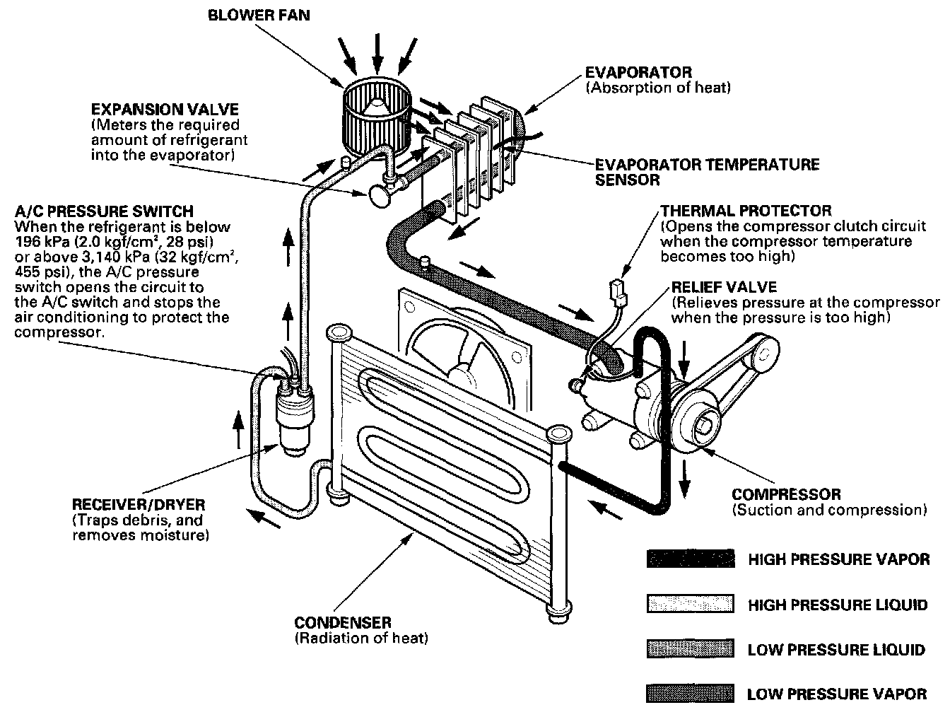 The air conditioning system removes heat from the passenger compartment by circulating refrigerant through the system as shown.