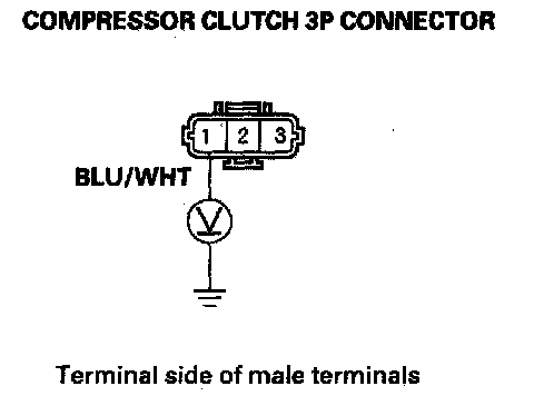 17. Measure the voltage between the No.1 terminal of the compressor clutch 3P connector and body ground.