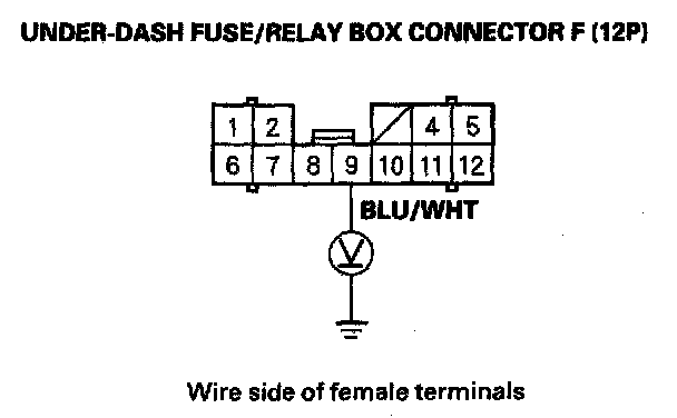 19. Measure the voltage between the No.9 terminal of under-dash fuse/relay box connector F (12P) and body ground with the under-dash fuse/relay box connectors connected.