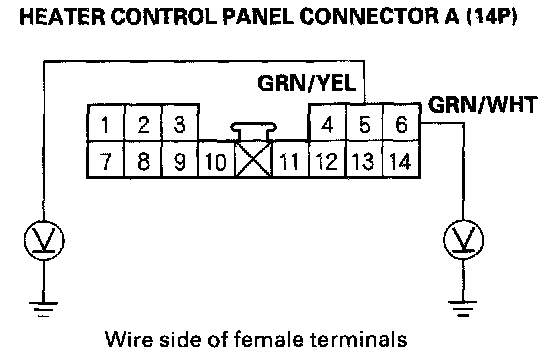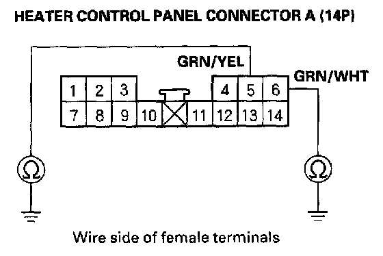 8. Check for continuity between the No.5 and No.6 terminals of heater control panel connector A (14P) and body ground individually.