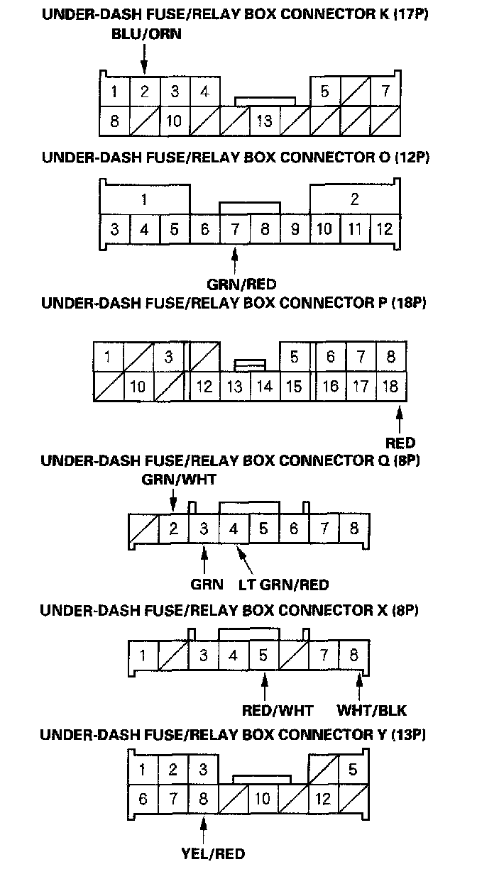 6. Reconnect the connectors to the under-dash fuse/relay box, turn the ignition switch ON (II) to wake-up the system, then make these input tests at the appropriate connectors on the under-dash fuse/relay box