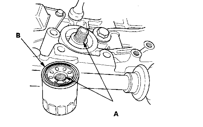 2. Inspect the threads (A) and rubber seal (B) on the new filter. Wipe off the seat on the engine block, then apply a light coat of oil to the filter rubber seal. Use only filters with a built-in bypass system.