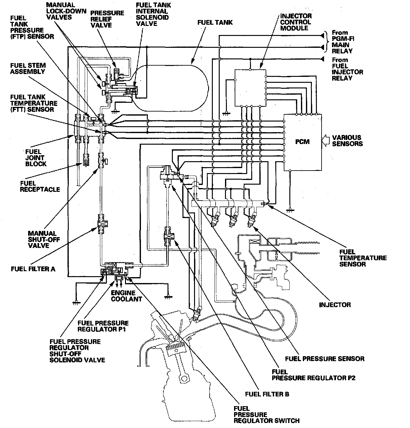 The PGM-FI relay consists of two separate relays. PGMF1 main relay 1 is energized whenever the ignition switch is ON (II). It supplies battery voltage to the PCM, powers injectors, and powers PGM-FI main relay 2. PGM-FI main relay 2 is energized to supply power to the fuel pressure regulator shut-off solenoid valve/fuel tank internal solenoid valve for 2 seconds when the ignition switch is turned ON (II), and when the engine is running.