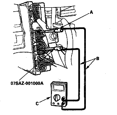 1. Connect the backprobe adapters (A) to the stacking patch cords (B), and connect the cords to a digital multimeter (C).
