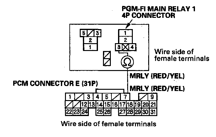NO - Repair open in the wire between PGM-FI main relay 1 and the PCM (E7).