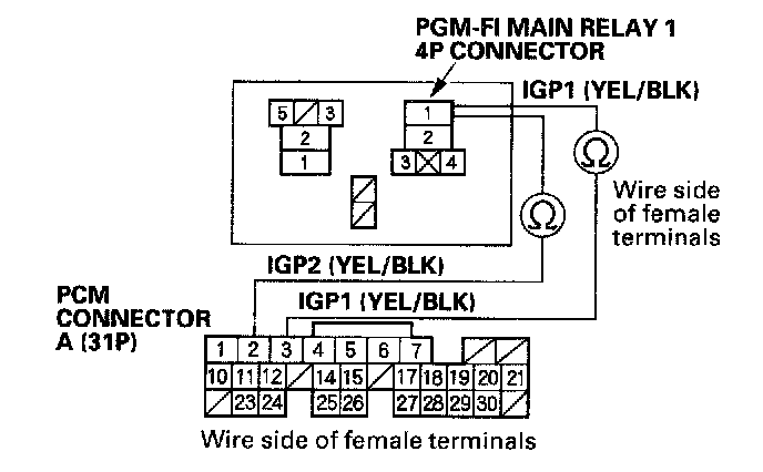 21. Check for continuity between PGM-FI main relay 14P connector terminal No.1 and body ground.