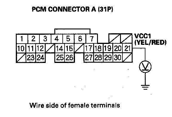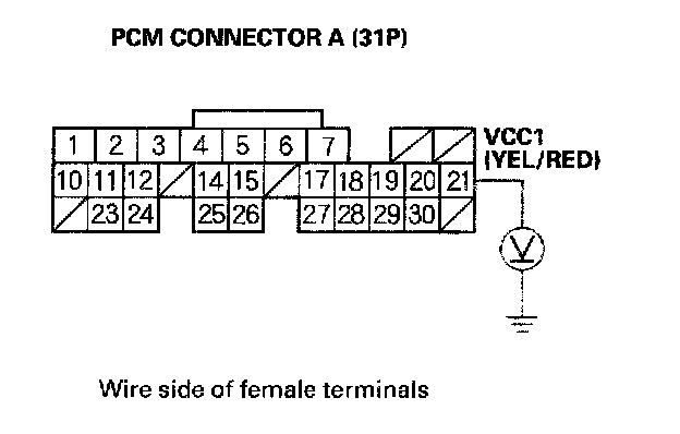 56. Disconnect the 3P connector from each of these sensors, one at a time, and measure voltage between body ground and PCM connector terminal A21 with the ignition switch ON (II).