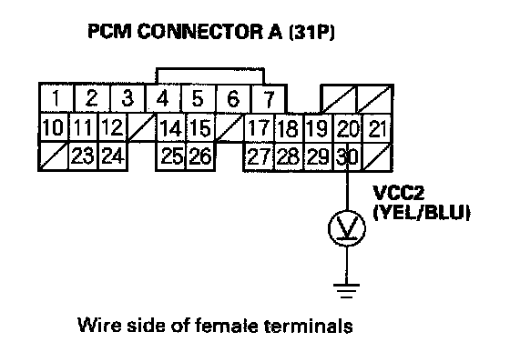 63. Disconnect the 3P connector from each of these sensors, one at a time, and measure voltage between body ground and PCM connector terminal A20 with the ignition switch ON (II).