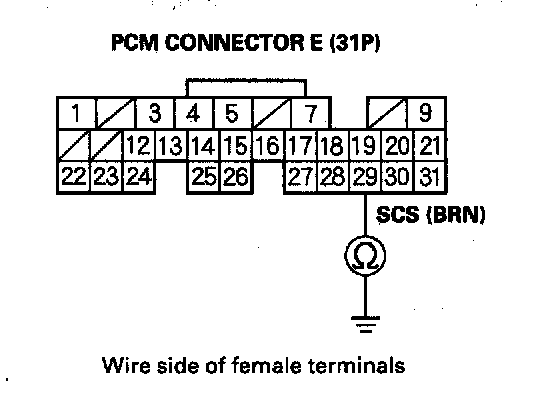 27. Check for continuity between PCM connector terminal E9 and body ground.