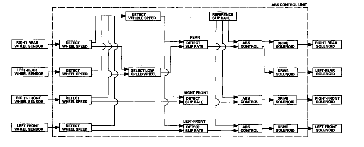 The ABS control unit detects the wheel speed based on the wheel sensor signal it received, then it calculates the vehicle speed based on the detected wheel speed. The control unit detects the vehicle speed during deceleration based on the rate of deceleration.