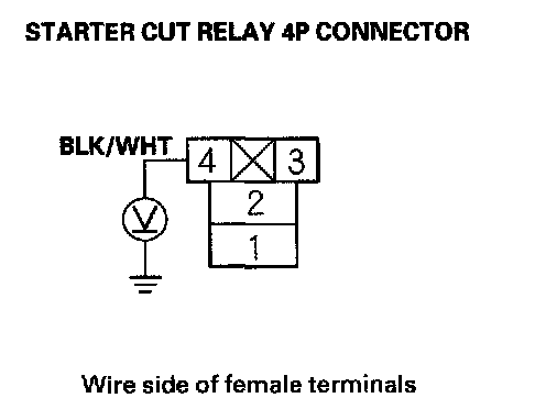 6. Measure the voltage between starter cut relay 4P connector terminal No. 2 and body ground with the ignition switch in START (III).