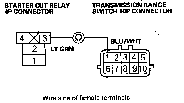 9. Check for continuity between starter cut relay 4P connector terminal No. 3 and transmission range switch 10P connector terminal No. 1.