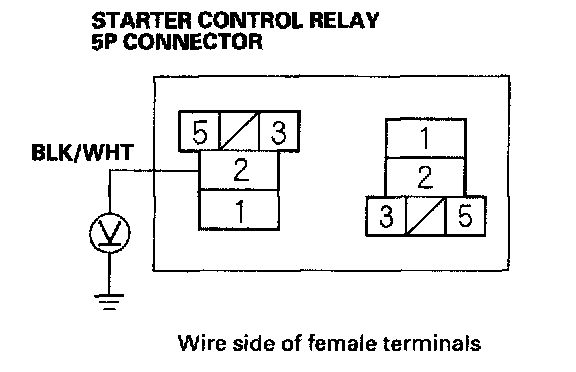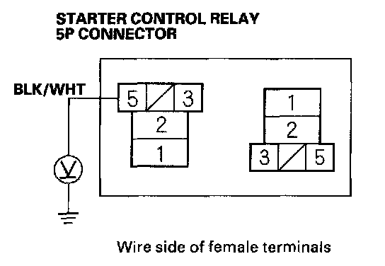 12. Measure the voltage between starter control relay 5P connector terminal No. 5 and body ground with the ignition switch in START (III).