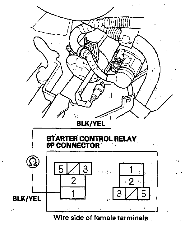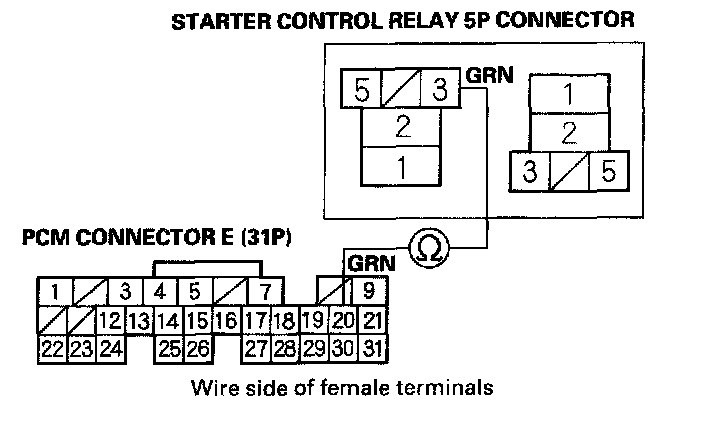 NO - Repair an open in the wire between starter control relay 5P connector terminal No. 3 and PCM connector terminal E20.