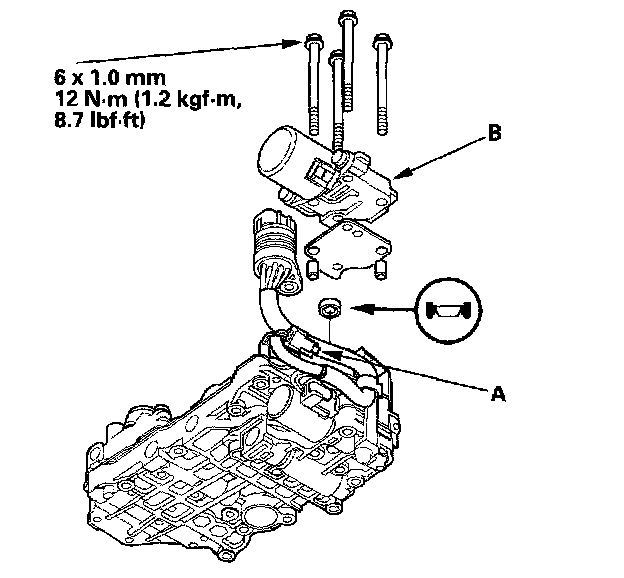 3. Remove the four bolts, and remove the CVT start clutch pressure control valve assembly (B).